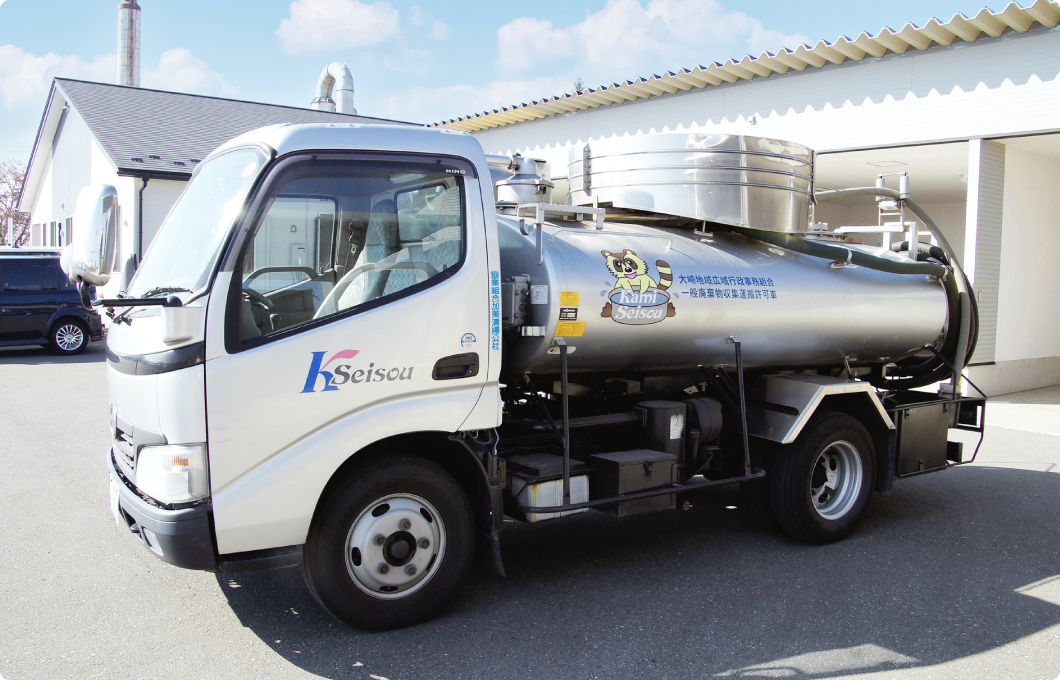 加美郡全域の一般住宅・公共施設・事業所および工場などの、し尿の汲み取りや浄化槽汚泥の抜取り作業を行っています。バキューム車は、3トン車・4トン車ともに5台ずつ計10台を保有しています。